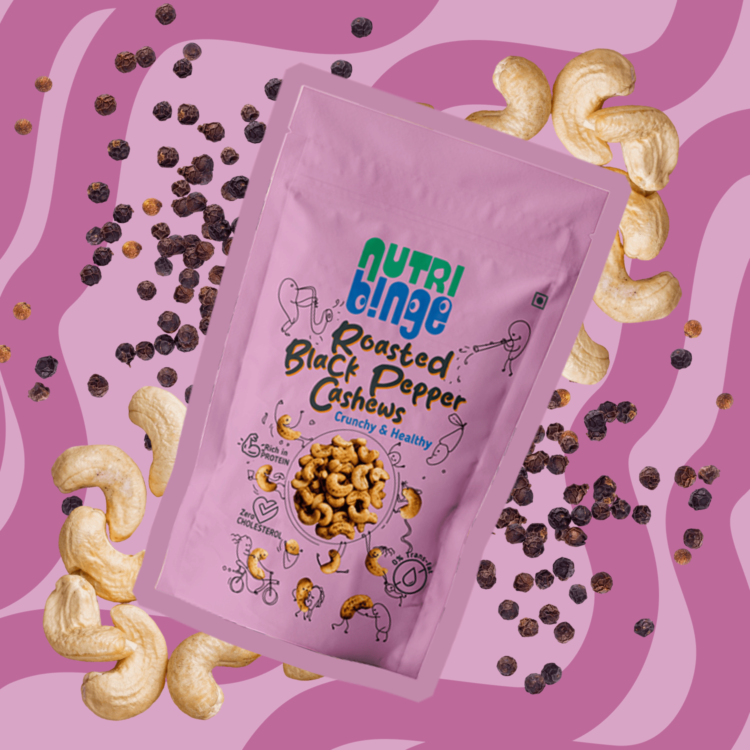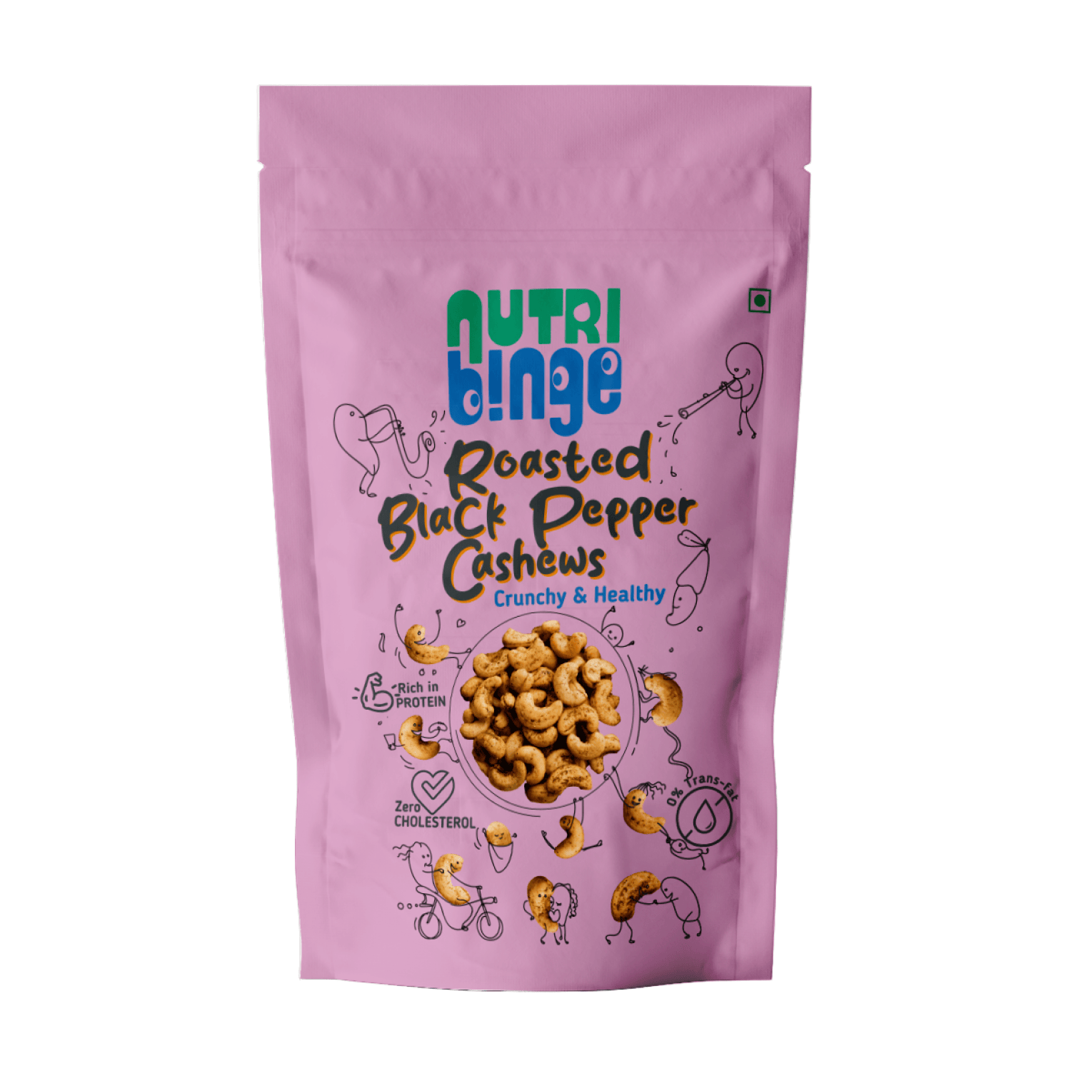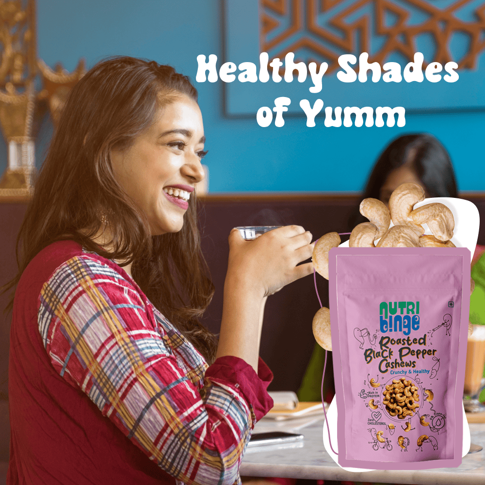 - When Health meets Binge : Now healthy food is gonna be yummy too. The peppery flavour to the cashews make the Nutri Binge Roasted Black Pepper Cashews an irresistibly tasty snack to binge on.The best part is all this comes in the form of clean, healthy snacking free of preservatives, Trans Fats and Cholesterol.