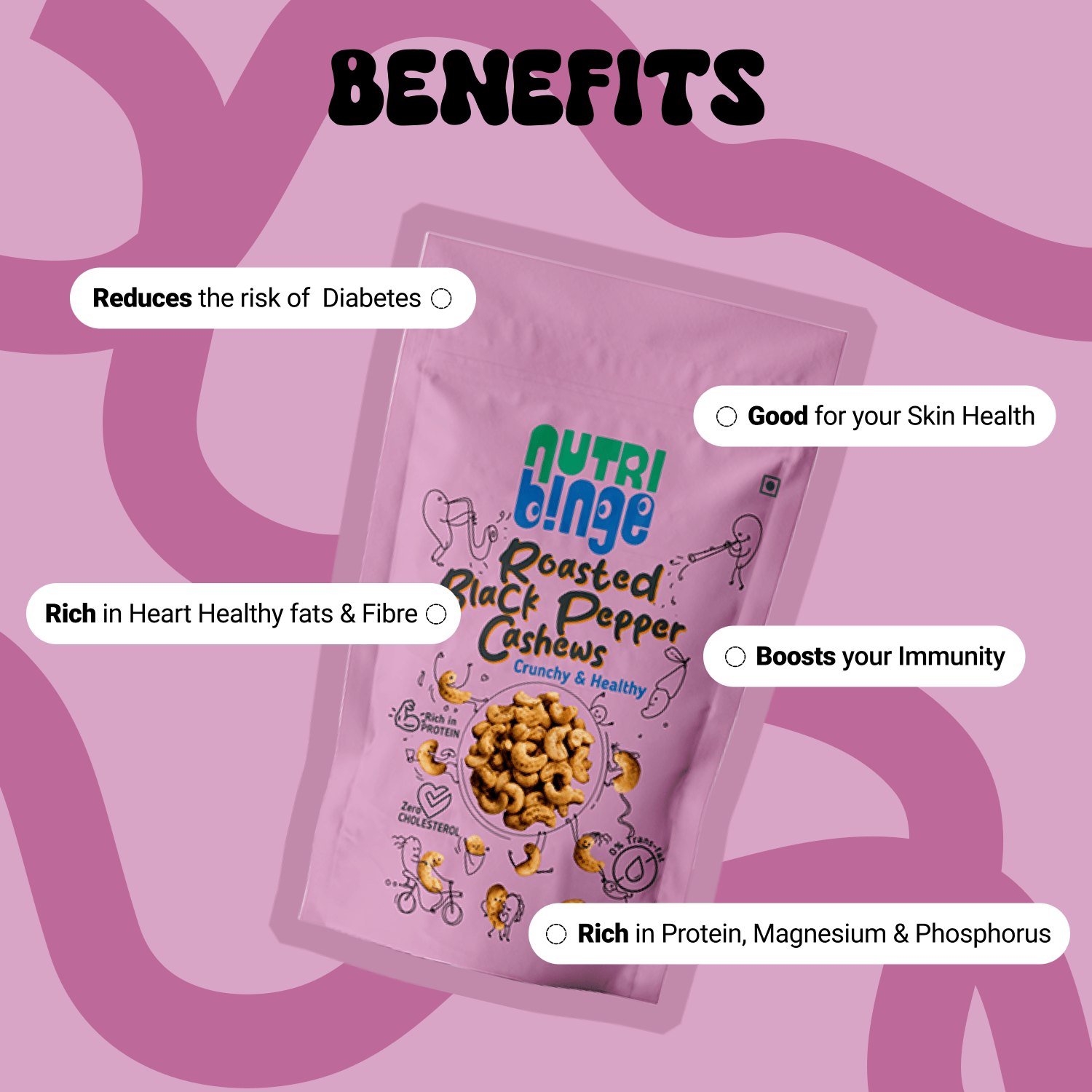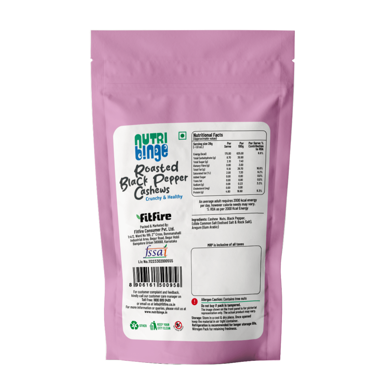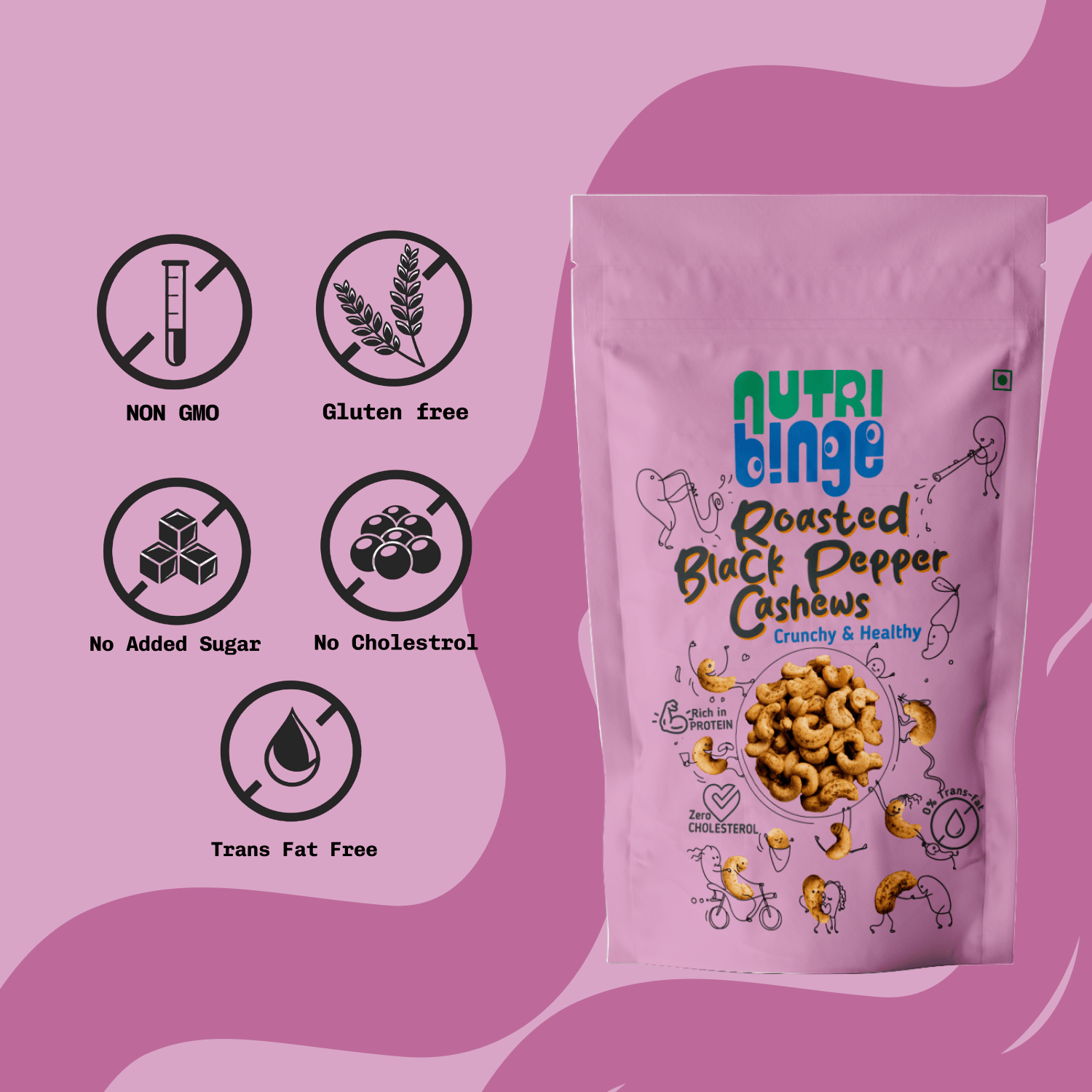 - When Health meets Binge : Now healthy food is gonna be yummy too. The peppery flavour to the cashews make the Nutri Binge Roasted Black Pepper Cashews an irresistibly tasty snack to binge on.The best part is all this comes in the form of clean, healthy snacking free of preservatives, Trans Fats and Cholesterol.