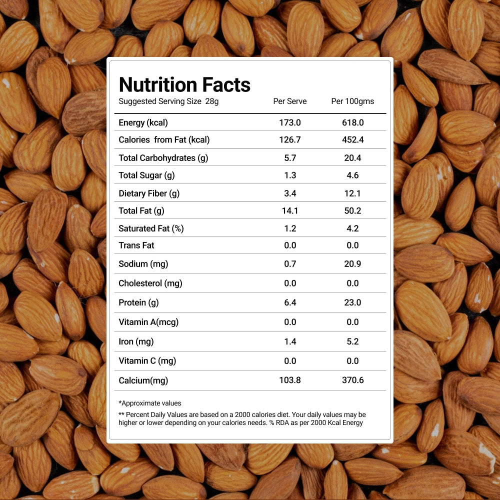 Super Food: Almond is a superfood that contains a whopping 20 grams of Protein and 12 grams of fibre in every 100 grams.Almonds also contain heart healthy monounsaturated fats. The best part is we get all this from a natural food free of preservatives, trans fats and Cholesterol.