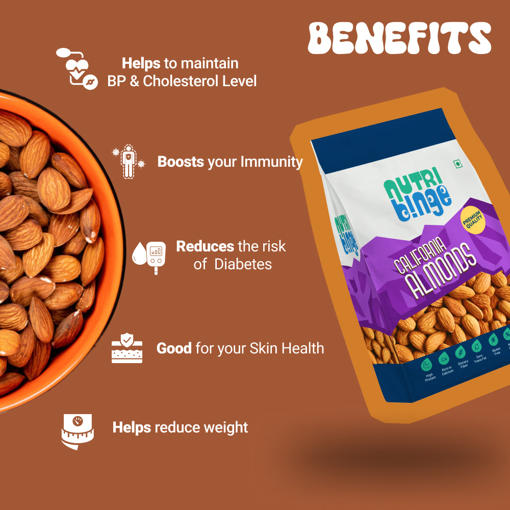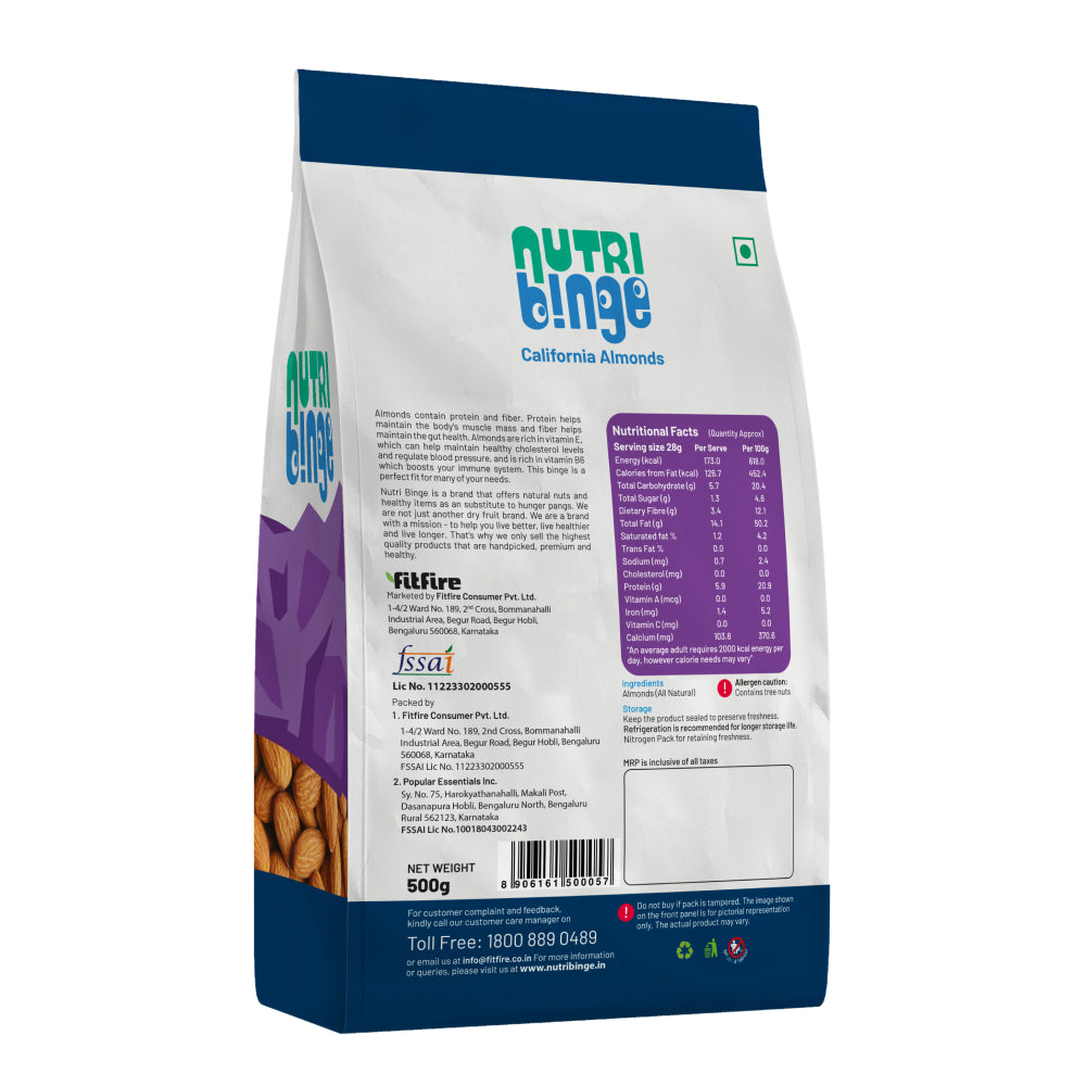 - California Almonds: Nutri Binge Almonds are sourced from the beautiful San Joaquin Valley in California where we get the world’s most premium quality almonds.