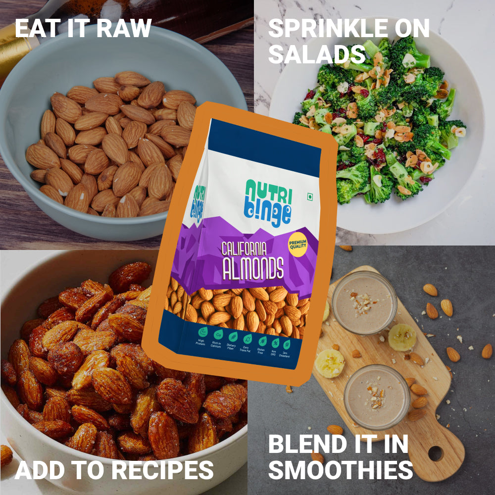 - Vitamins: California Almonds are rich in Vitamin E that is an antioxidant preventing oxidative damage in the cells and Vitamin B(B2,B3, B5 and B6) that help in Nutri charging us by boosting our mechanism.