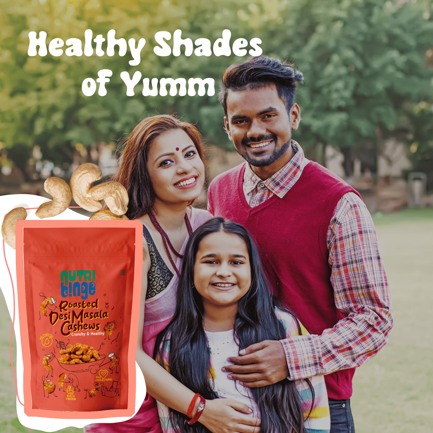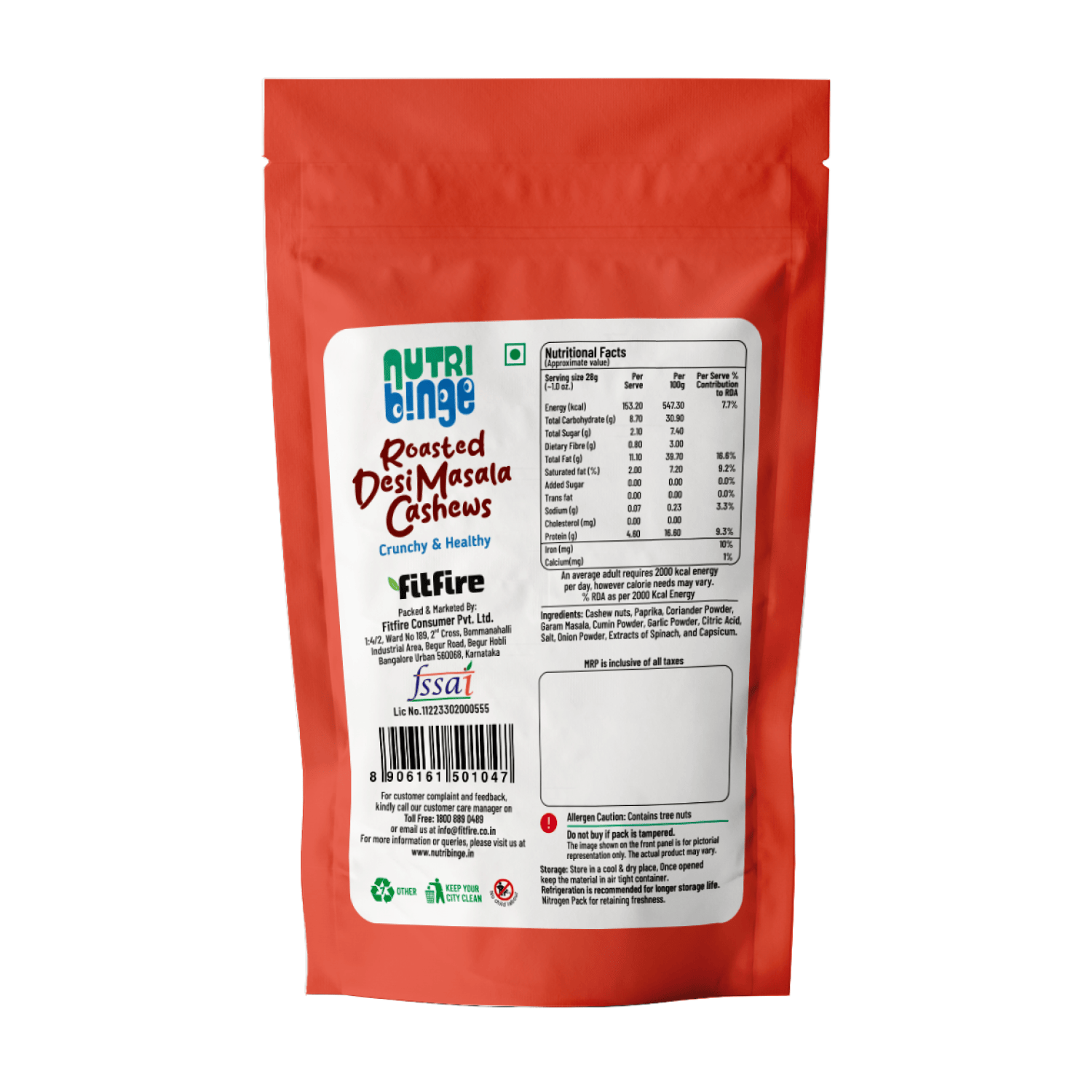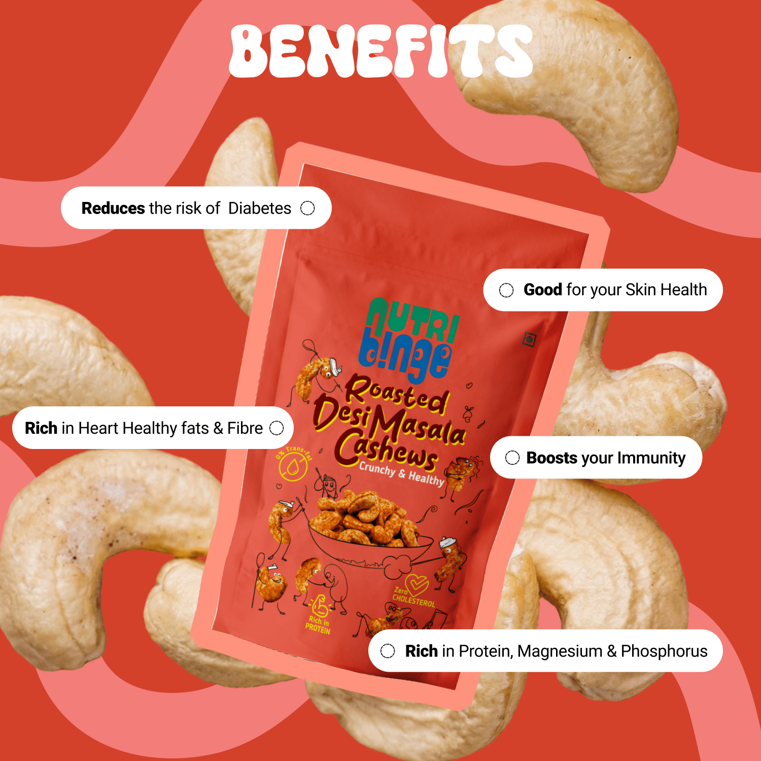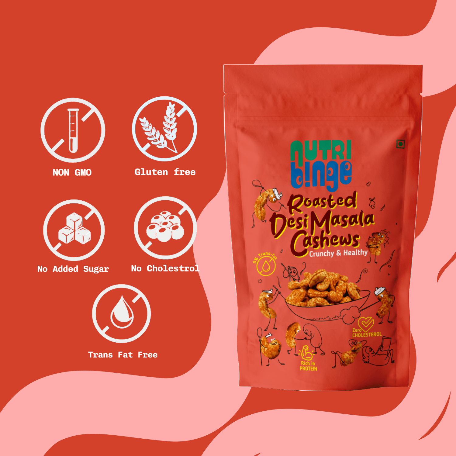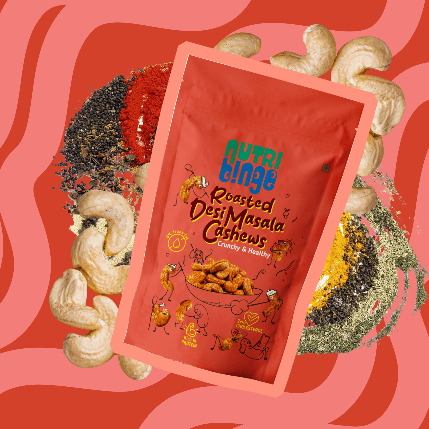 - When Health meets Binge : Now healthy food is gonna be yummy too. The crunchy cashews sprinkled with the tangy “Chat patta” spiciness of various hand picked spices make Nutri Binge Roasted Desi Masala Cashews an irresistibly tasty snack to binge on.The best part is all this comes in the form of clean, healthy snacking free of preservatives, Trans Fats and Cholesterol.