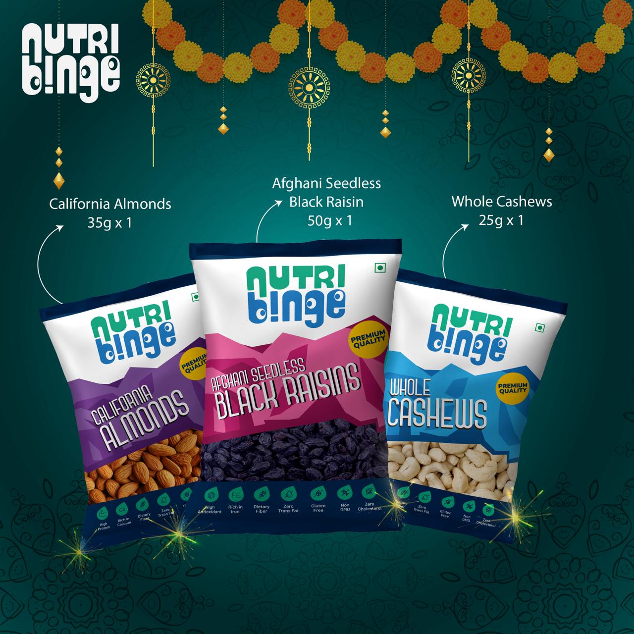 This token of love has a premium assortment of Nutri Binge California Almonds 35g, Nutri Binge Whole Cashews 25g and Nutri Binge Afghani Seedless Black Raisins 50g.