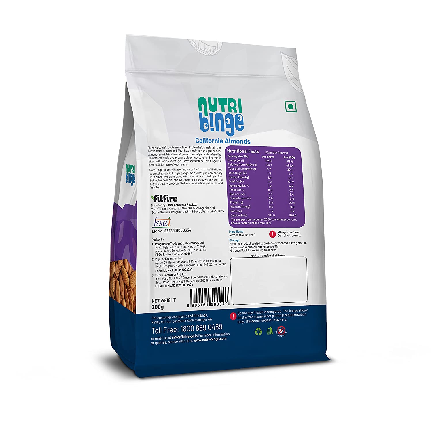 - California Almonds: Nutri Binge Almonds are sourced from the beautiful San Joaquin Valley in California where we get the world’s most premium quality almonds.