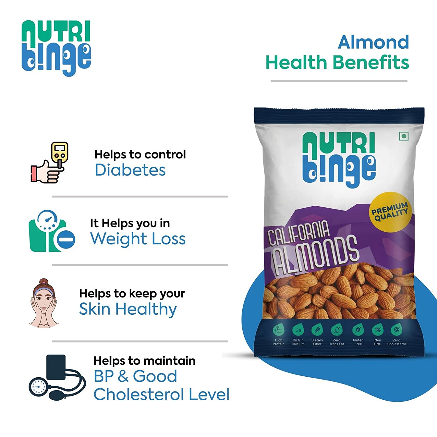 - California Almonds: Nutri Binge Almonds are sourced from the beautiful San Joaquin Valley in California where we get the world’s most premium quality almonds.