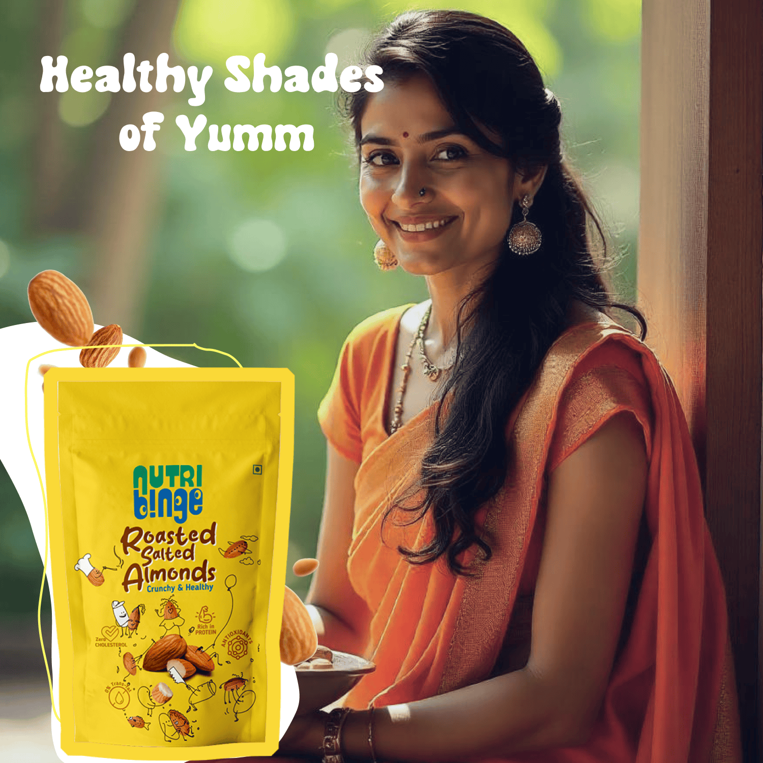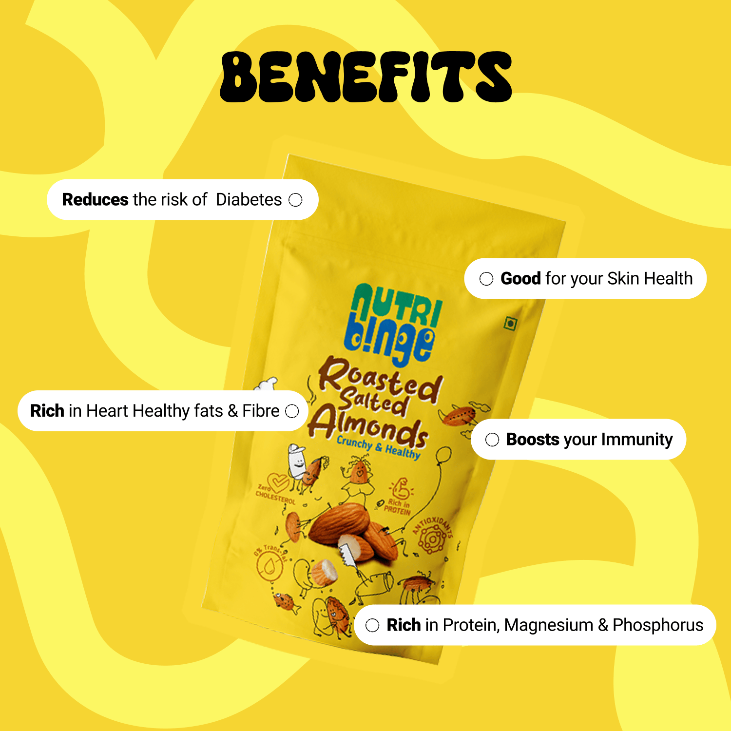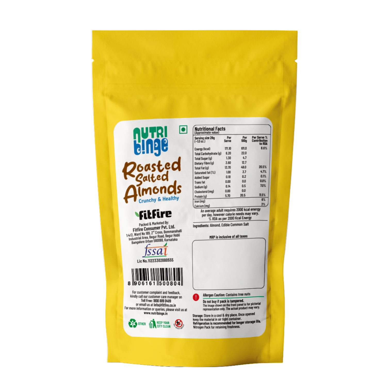 When Health meets Binge : Now healthy food is gonna be yummy too. The crunchy handpicked almonds are carefully roasted with a layered coating of iodised salt slowly converting Nutri Binge Roasted Salted Almonds into an irresistible snack to binge on. The best part is all this comes in the form of clean, healthy snacking free of preservatives, Trans Fats and Cholesterol.