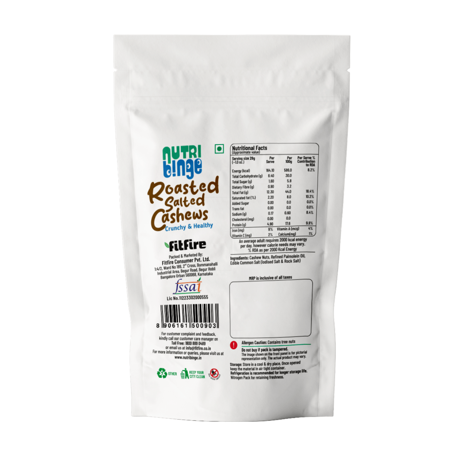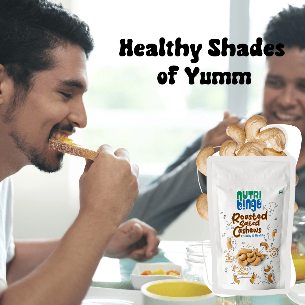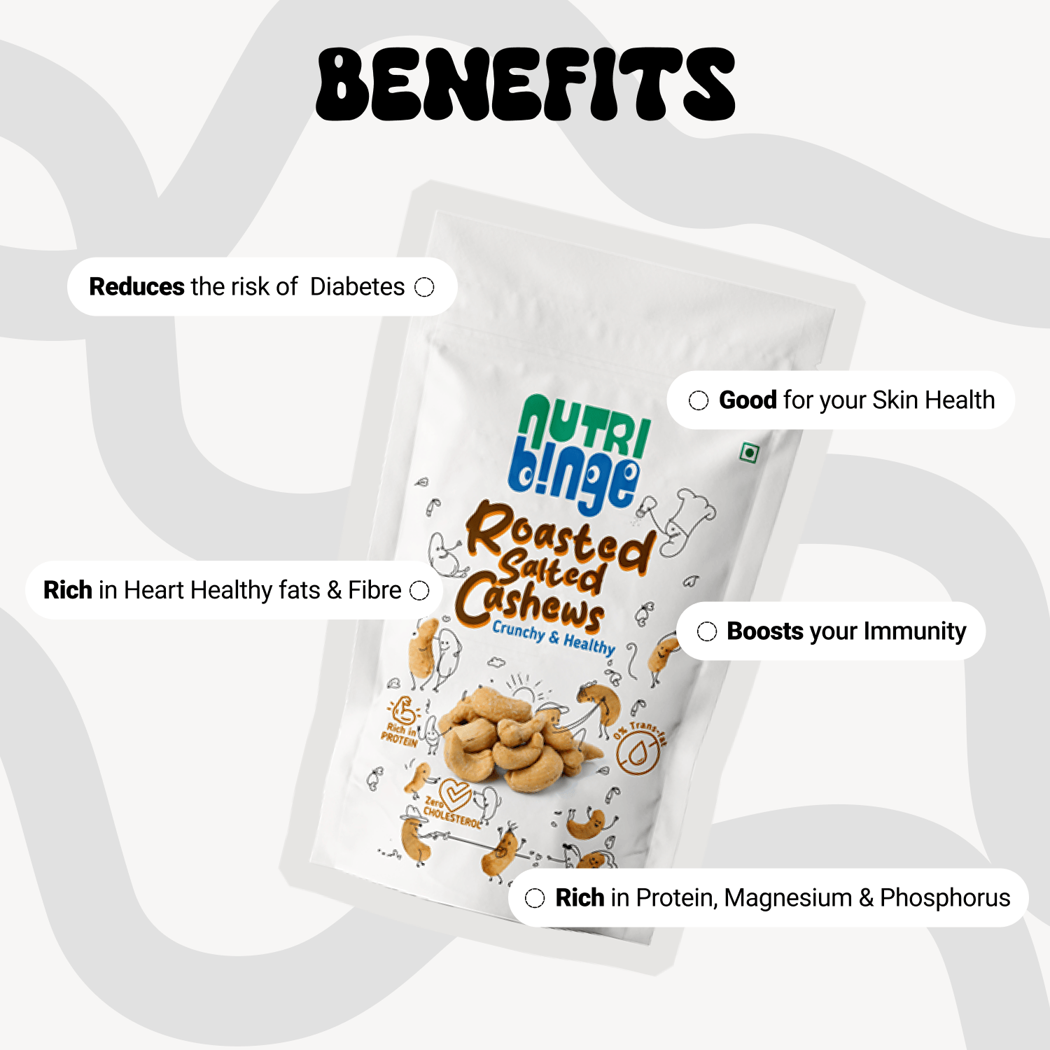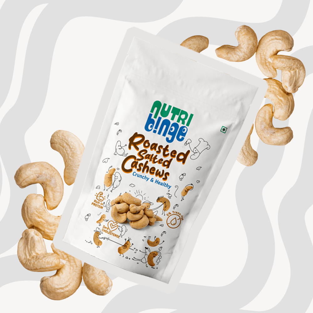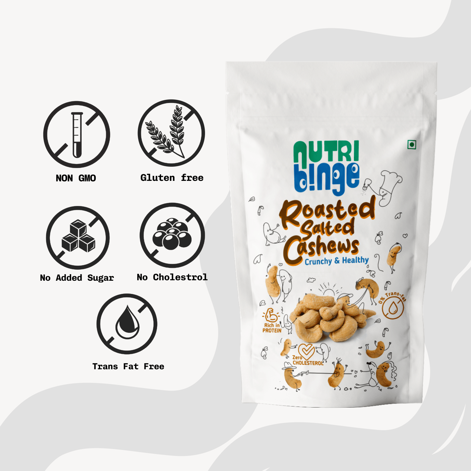 - When Health meets Binge : Now healthy food is gonna be yummy too. The crunchy cashews sprinkled with a bit of salt make the Nutri Binge Roasted Salted Cashews an irresistibly tasty snack to binge on.The best part is all this comes in the form of clean, healthy snacking free of preservatives, Trans Fats and Cholesterol.
